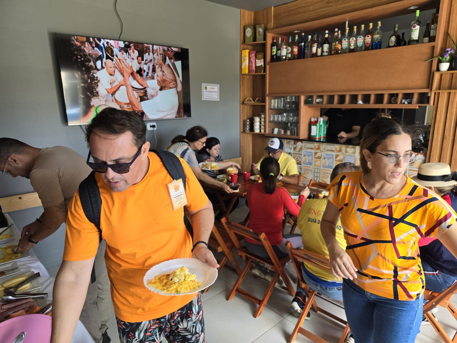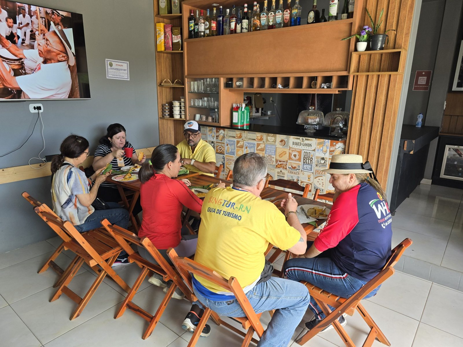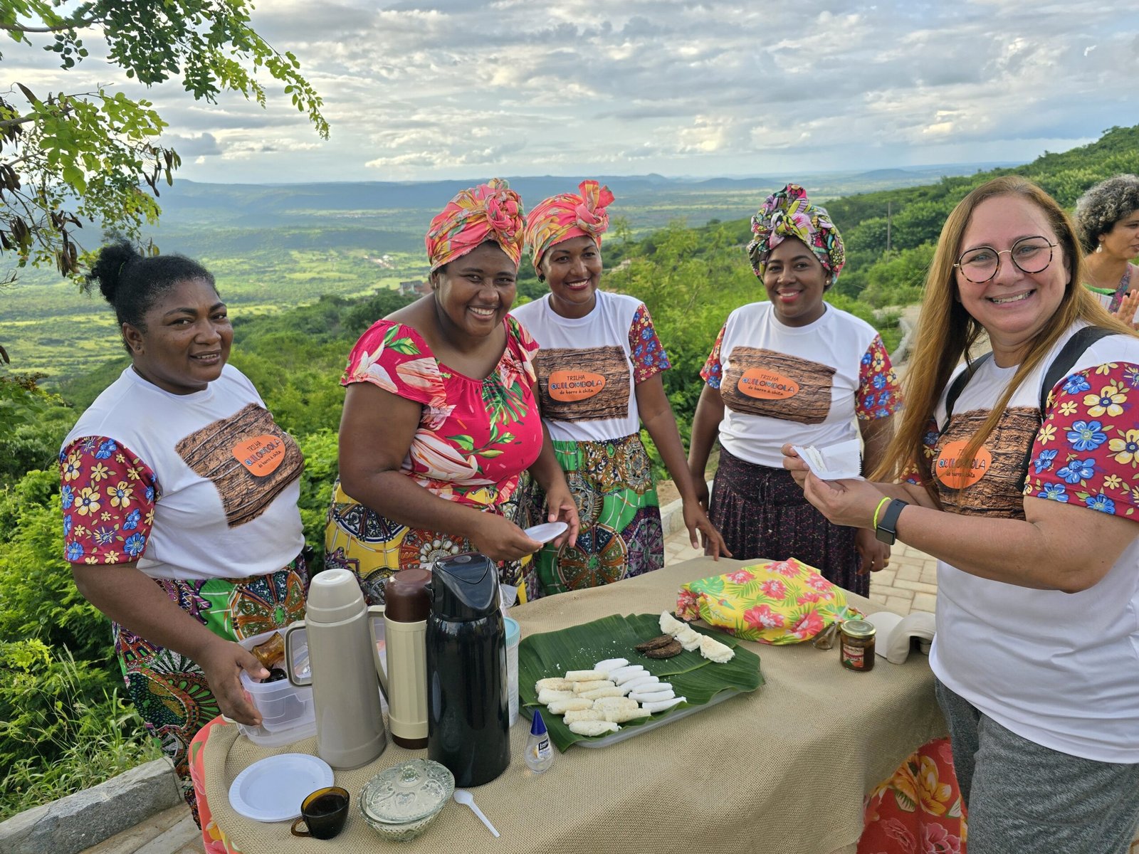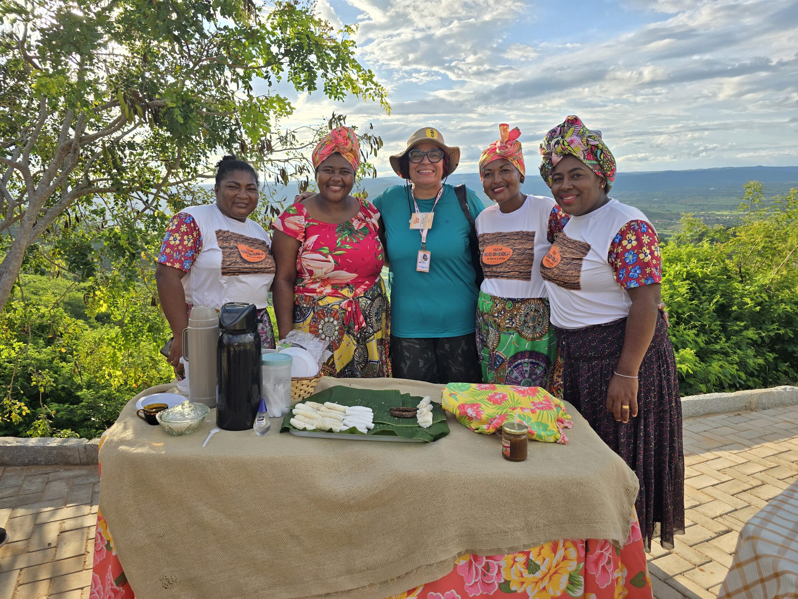 Dando continuidade ao famtour, o grupo se dirigiu para a arena em frente a Cruz da Menina, para contemplarem o pôr do Sol e a vista panorâmica da serra e das cidades circunvizinhas. Tudo isso, ao som da banda quilombola de pífano, que tocava sucessos do nosso forró. No local o grupo pôde degustar as delicias gastronômicas do “Café Quilombola”, com deliciosas tapiocas, beijus, pés de moleque, geleias e o tradicional cafezinho ou um chá.