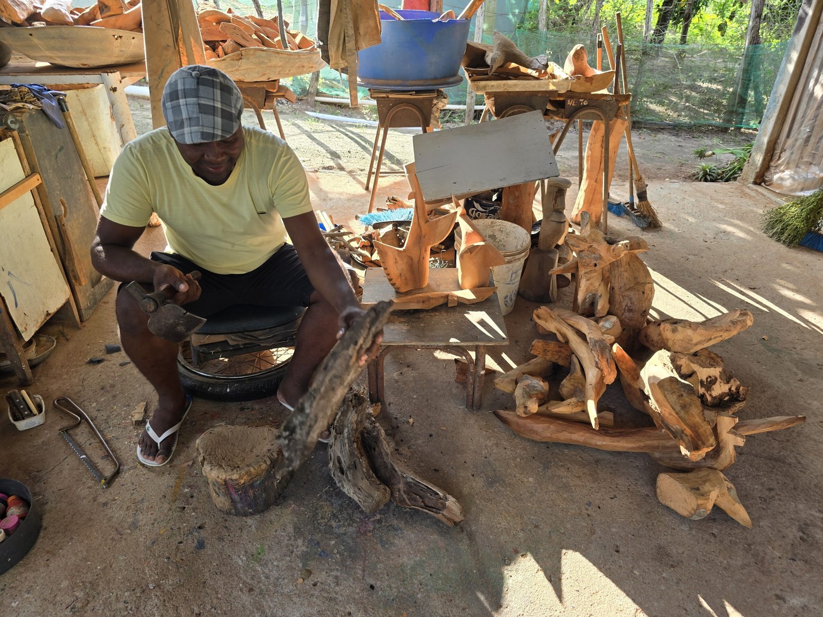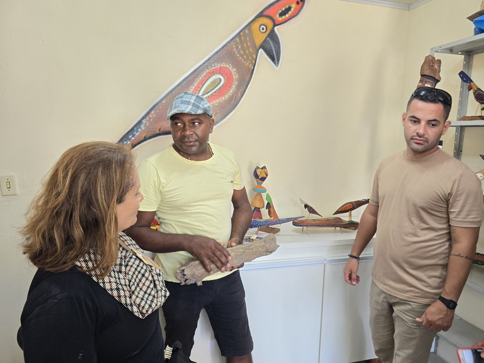Em seguida o grupo se dirigiu para o ateliê do artista plástico quilombola, Sérgio Teófilo, que mostrou suas esculturas de madeira com formato de pássaros e todo o processo de criação, até a finalização. Os pássaros de Sérgio Teófilo são únicos e de uma beleza e singularidade impares.