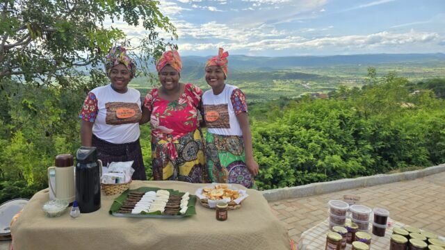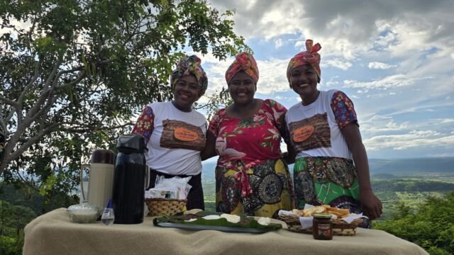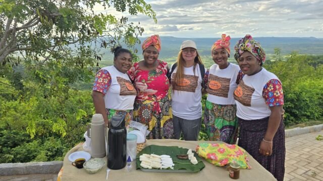 Imediatamente após, o grupo se encaminhou para a Associação Quilombola Cruz da Menina. Lá, foram recebidos por Bianca Quilombola, a presidente da associação, que compartilhou a rica história de como a comunidade se firmou e prosperou naquela região. Após a envolvente apresentação, os visitantes foram agraciados com um almoço autenticamente quilombola, destacando-se um saboroso prato de galinha de capoeira, meticulosamente preparado e acompanhado por uma seleção de guarnições tradicionais, obra das mãos experientes das mulheres da comunidade, evidenciando a riqueza cultural e a hospitalidade que define o quilombo.