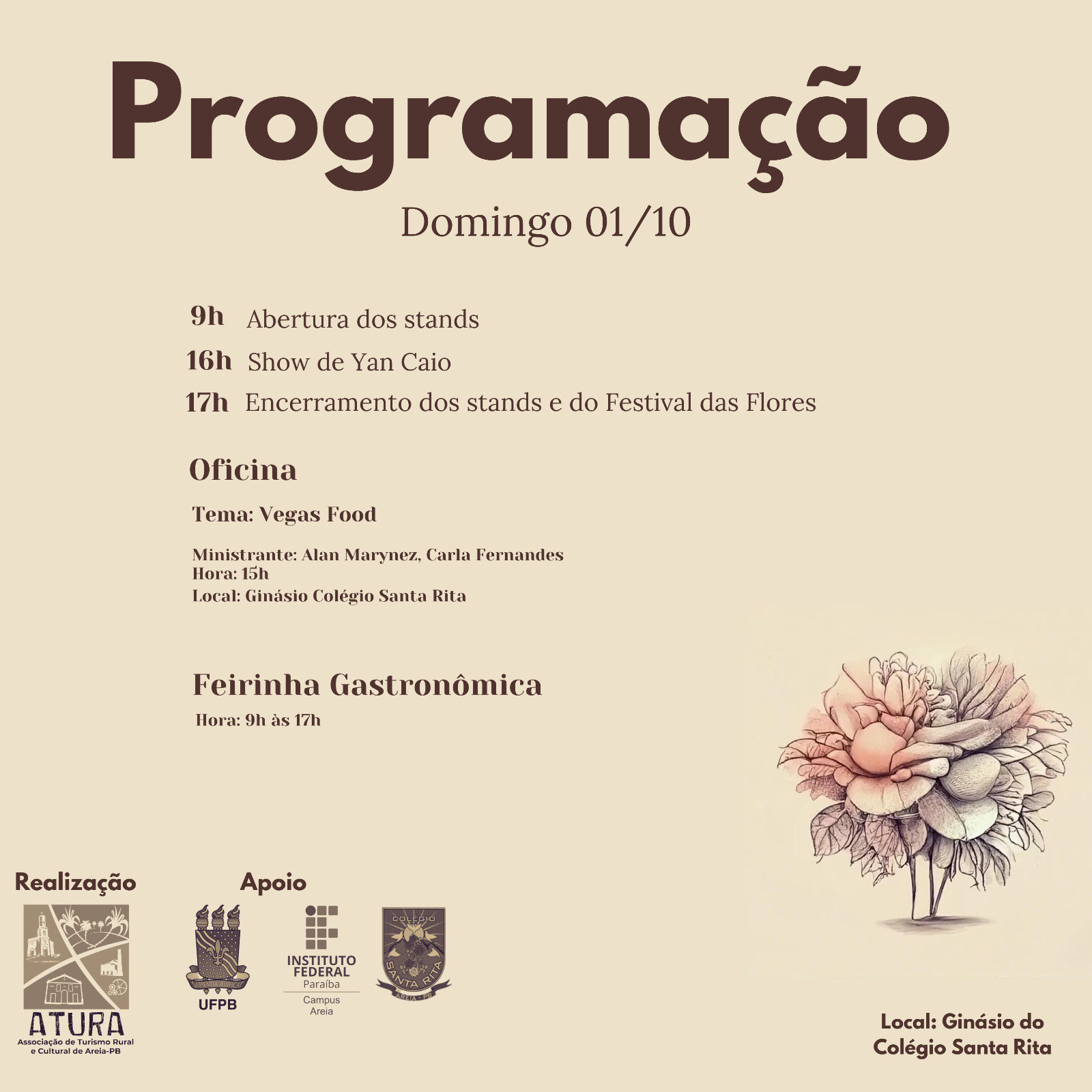 A cidade de Areia, situada no coração do Brejo da Paraíba, sediará a quinta edição do colorido Festival das Flores, de (29) a (1º) de outubro. O evento, organizado pela Associação de Turismo Rural e Cultural de Areia (Atura) e com parcerias com a Universidade Federal da Paraíba – UFPB Campus Areia, o Instituto Federal da Paraíba – IFPB Campus Areia e o Colégio Santa Rita, ocorrerá no histórico Ginásio do Colégio Santa Rita sob o Tema “Plante amor, tristeza não dá flor”.