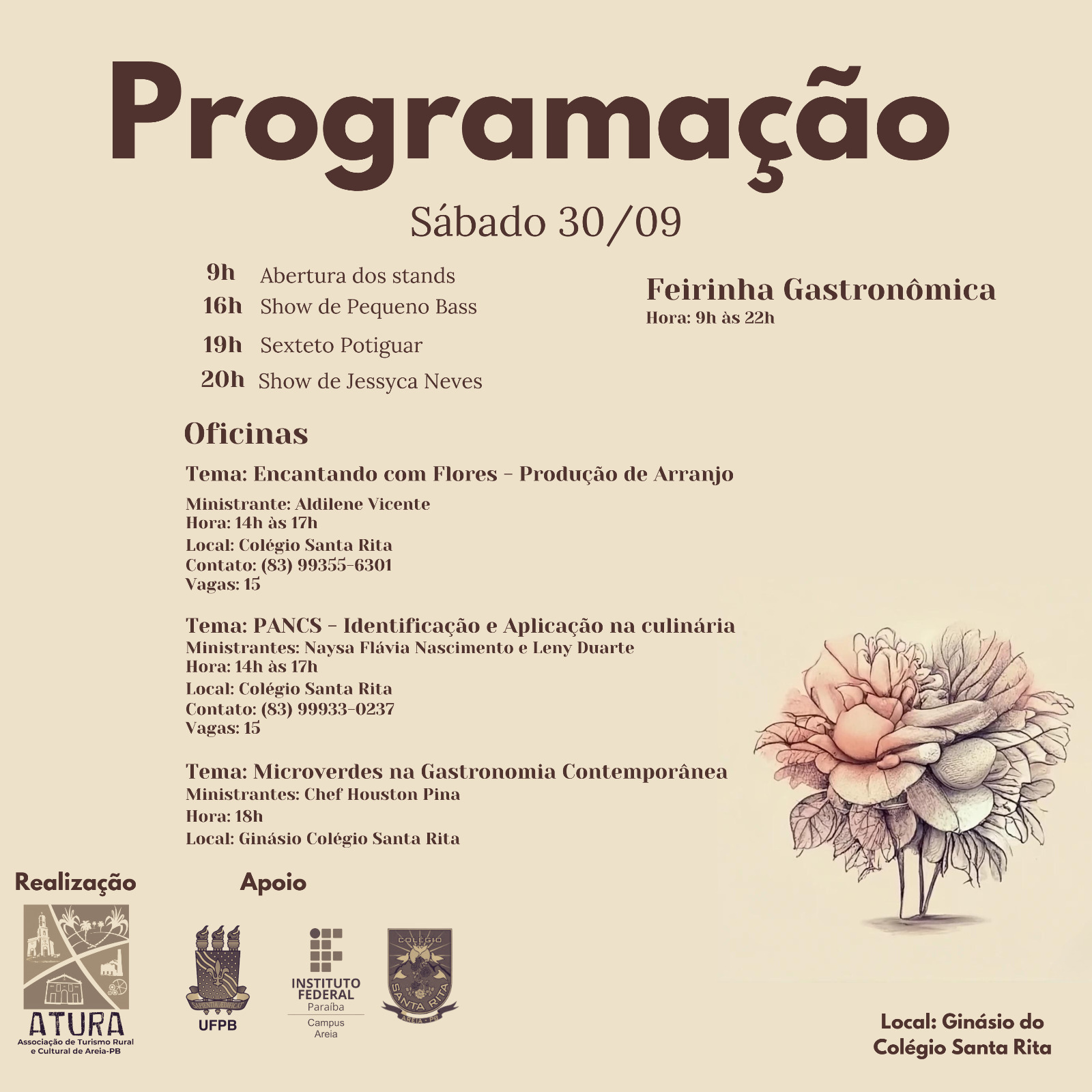 As atividades do sábado, dia (30), começarão às 9h e incluirão estandes expositores, oficinas de arranjos florais e aula show sobre como incorporar Pancs (flores comestíveis) na culinária. A noite de sábado concluirá com um show da talentosa cantora Jessyca Neves.