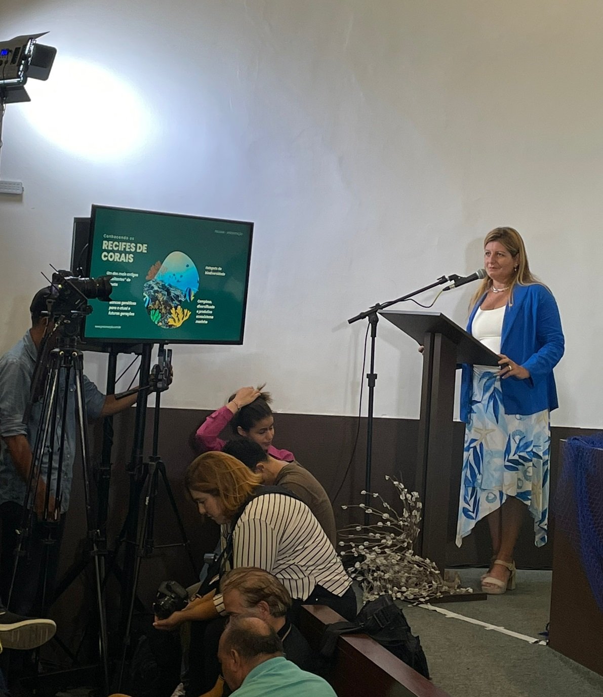 A decoração temática do auditório da Fundação foi assinada pelas Sereias da Penha, artesãs da Praia do Seixas, que utilizaram escamas do peixe Camurupim e conchas de mariscos.