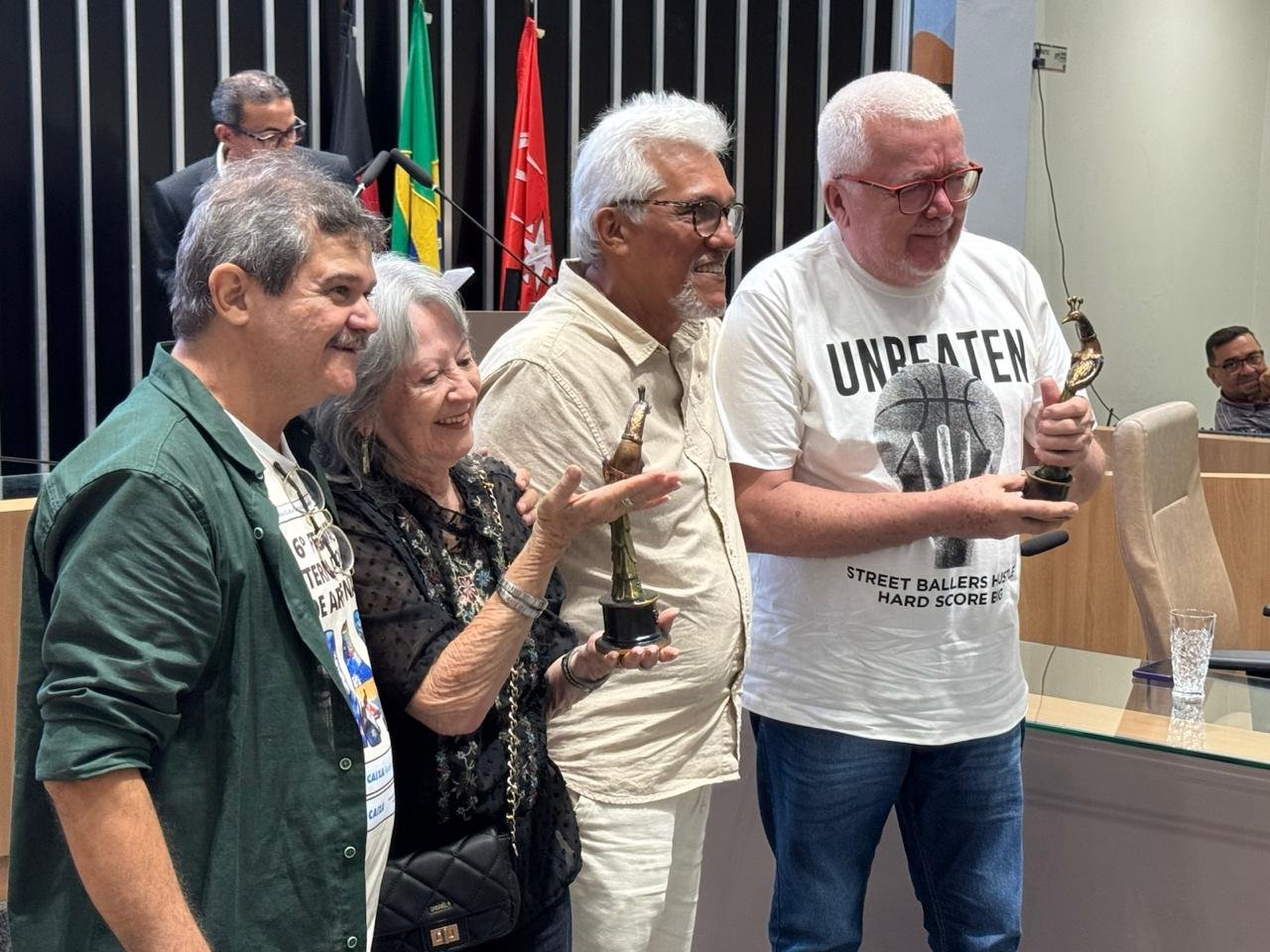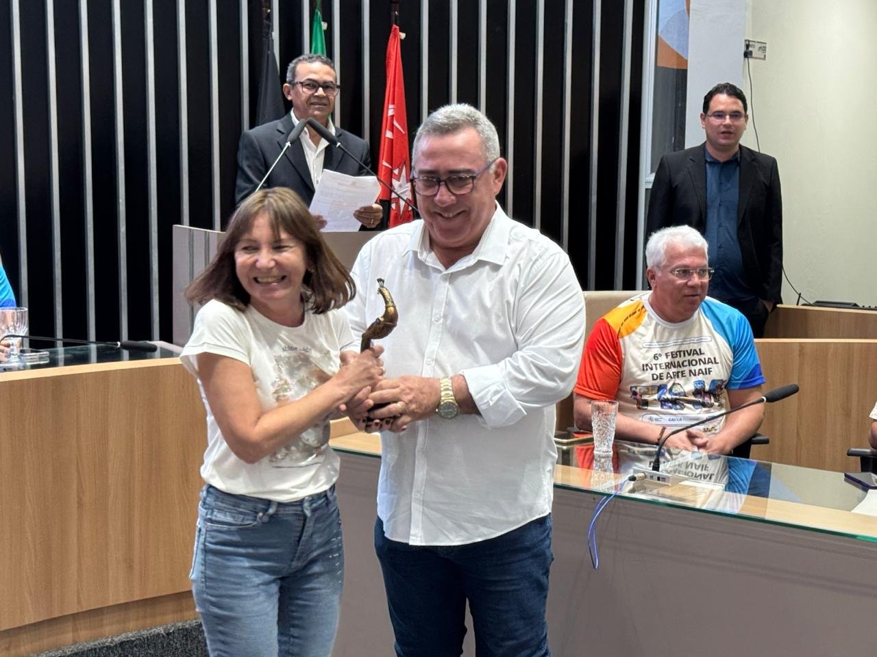 Outro destaque da noite foi o troféu entregue aos artistas premiados e homenageados, com design em formato de pavão, inspirado no célebre cordel O Pavão Misterioso, escrito por José Camelo de Melo Rezende, natural de Guarabira. O símbolo resgata a identidade cultural da cidade e reforça seu vínculo com a arte popular nordestina. A peça foi criada pelo artista Benjamim Carlos, que uniu tradição e design contemporâneo em uma obra de grande valor simbólico.