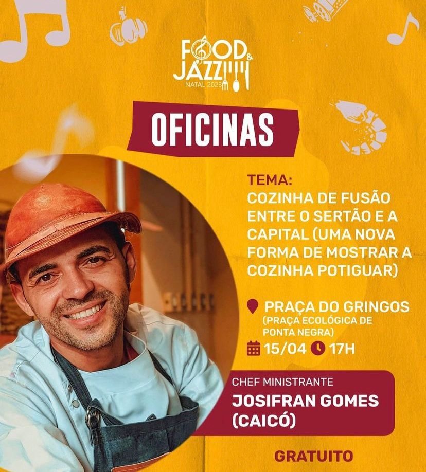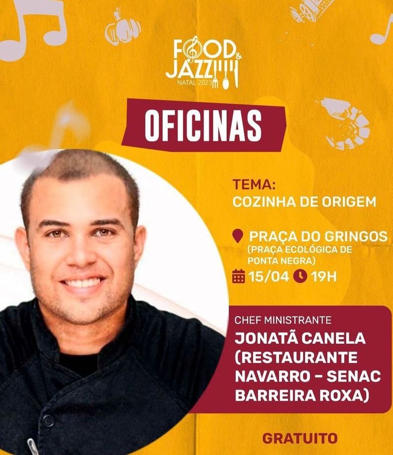 No sábado (15), a partir das 17h, a Cozinha Show Food & Jazz Natal, inicia com a oficina “Cozinha Fusão entre o Sertão e a Capital – uma nova forma de mostrar a cozinha Potiguar”, com o chef Josifran Gomes (Caicó); e às 19h, o chef Jonatã Canela, do restaurante Navarro – Senac Barreira Roxa, ministra a oficina “Cozinha Origem”.