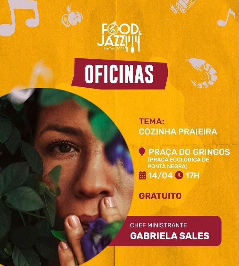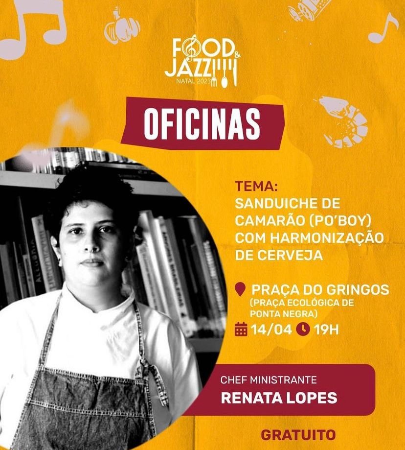 Para sexta (14), a partir das 17h, a Cozinha Show Food & Jazz Natal, com a oficina “Cozinha Praieira”, realizada pela chef Gabriela Sales e convida o chef Tarcísio Gonçalves. Às 19h, oficina “Sanduíche de Camarão (Po’Boy), com harmonização de cerveja”, sob o comando da chef Renata Lopes.
