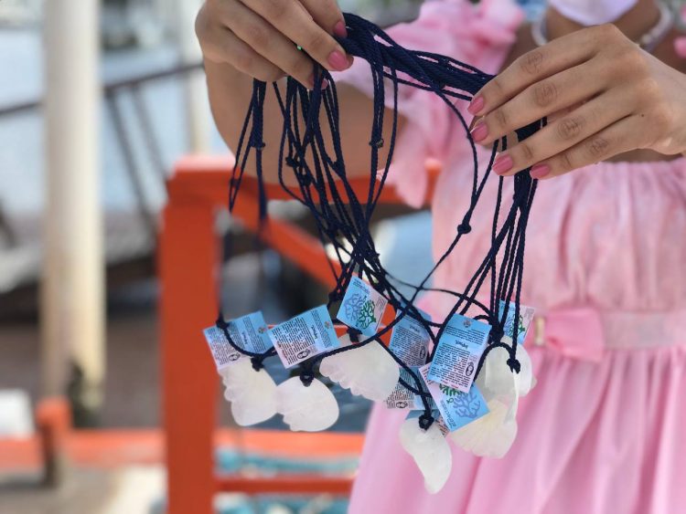 Também, na entrada, outra surpresa: o passaporte para subir a bordo do catamarã é um colar de escama de peixes, feito por artesãs locais.