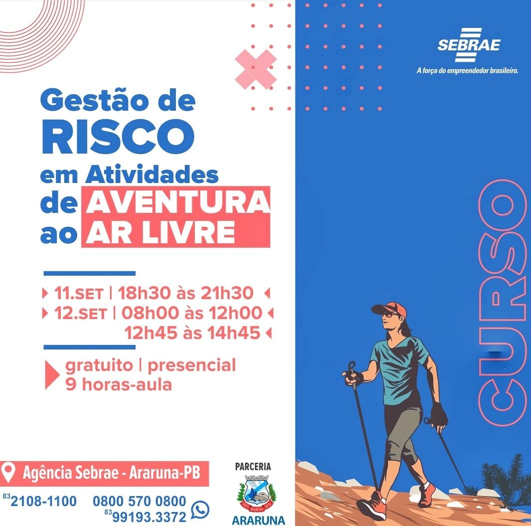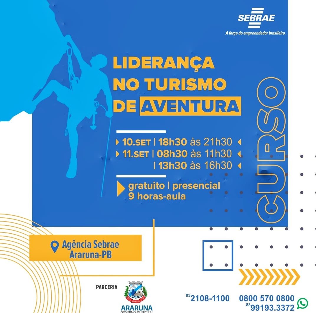A Prefeitura Municipal de Araruna (PB), por meio da Secretaria de Turismo, Desenvolvimento Econômico e Rural, em parceria com o Sebrae – Araruna realizará cursos voltados para a atividade de Turismo de Aventura e Ecoturismo como: Liderança no Turismo e Gestão de Risco em Atividades de Aventura ao Ar Livre. Os cursos são gratuitos e as inscrições já estão abertas e acontecerão nos dias (10), (11) e (12) de outubro, de forma presencial.