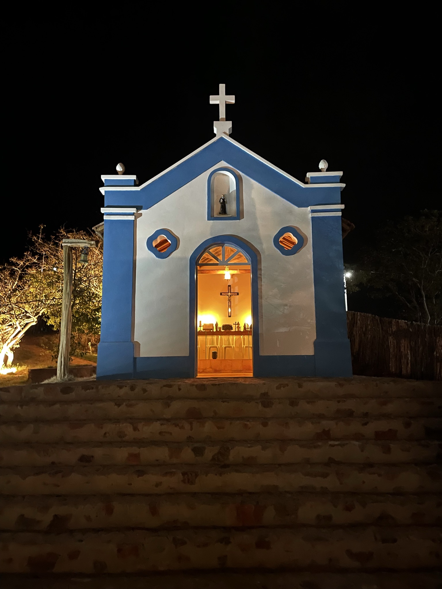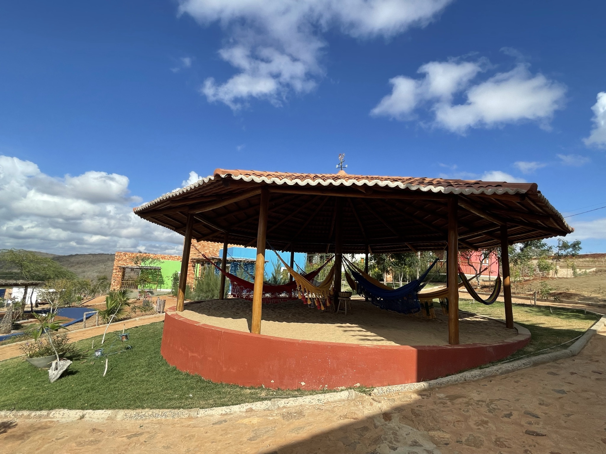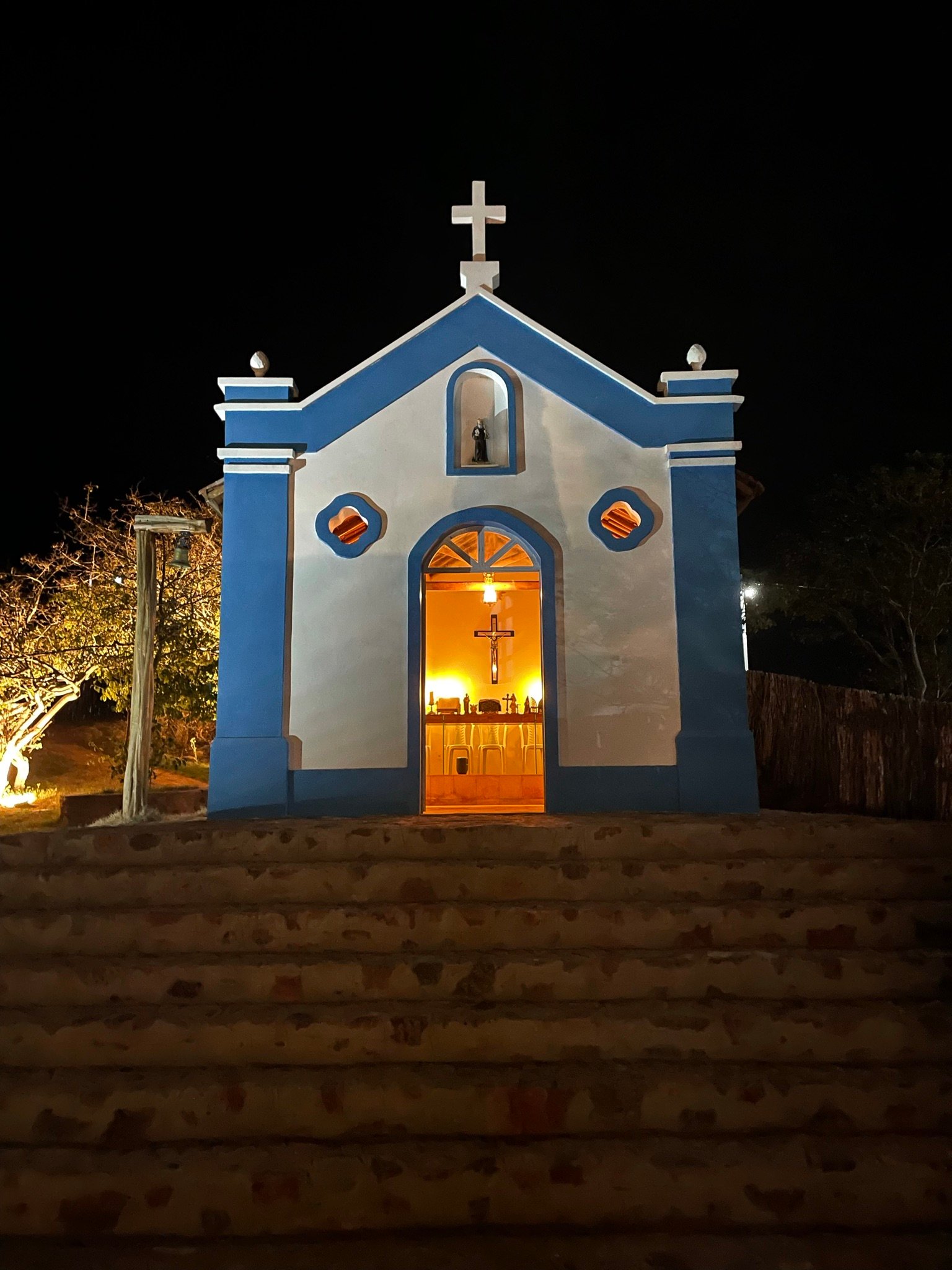 Na área externa da Pousada, chama a atenção a bela Capela de São Bento, que nos remete às construções jesuíticas das primeiras Vilas do Brasil Colônia. Também conhecemos a área de eventos, restaurante, redário, piscina, parquinho para crianças, comedouro para pássaros, cercadinho com gansos e o Sítio Sebastião Xavier, construído em homenagem ao pai do Sergeano Xavier e onde existe uma pequena bodega temática (que leva o nome do amigo Fabiano, que faleceu), com fumo de rolo, bolas de gude, balança com pesos dentre outros objetos que nos levam ao passado de nossos avós.