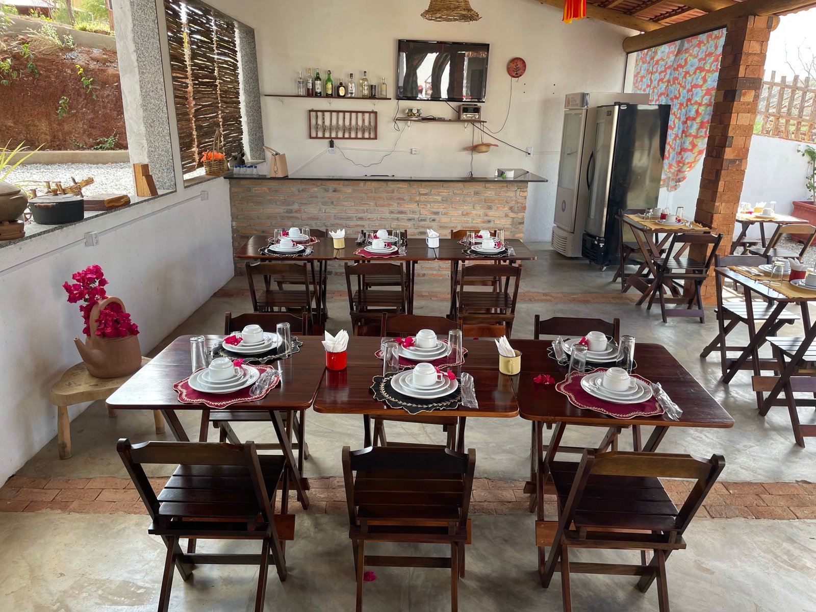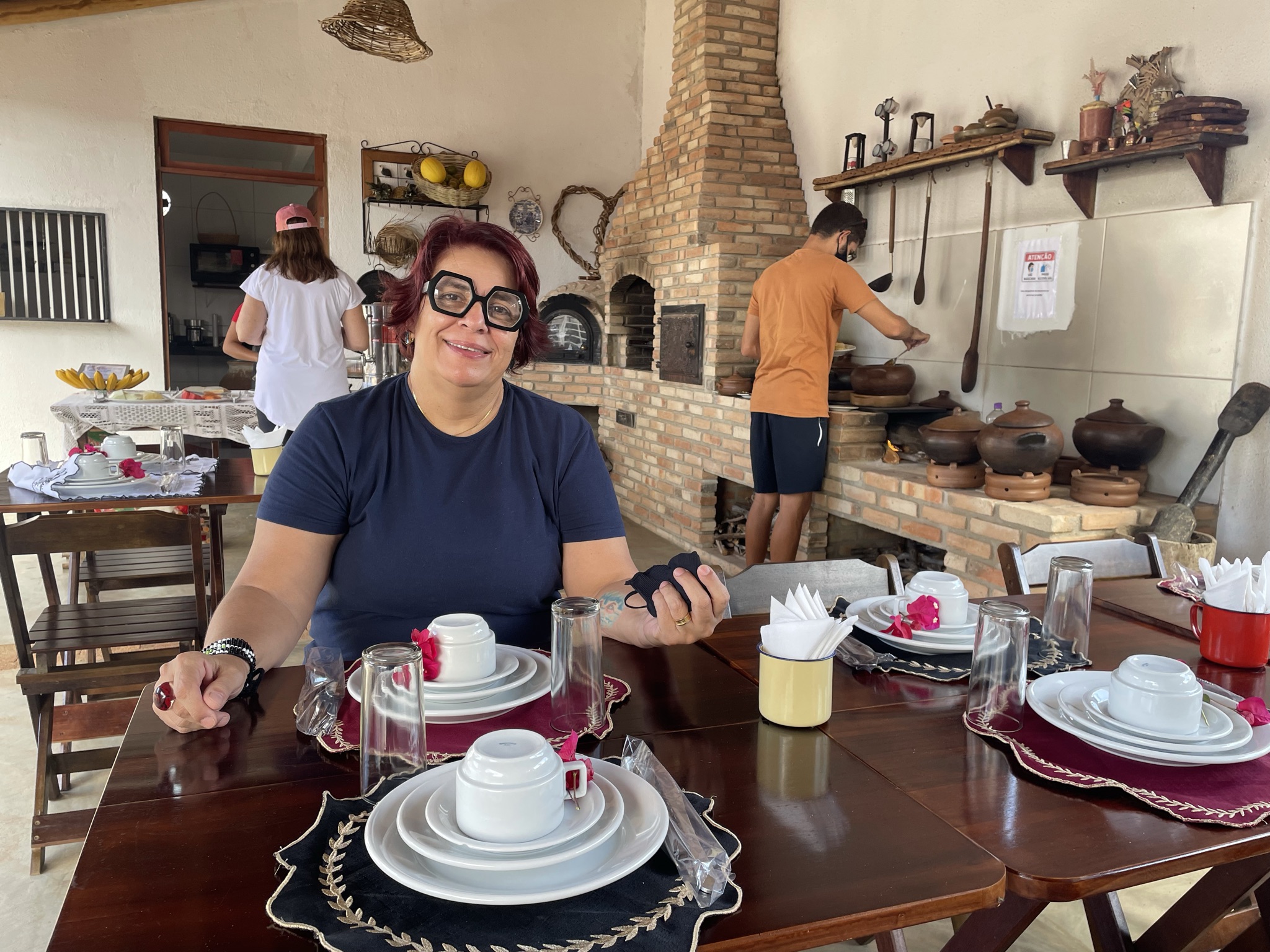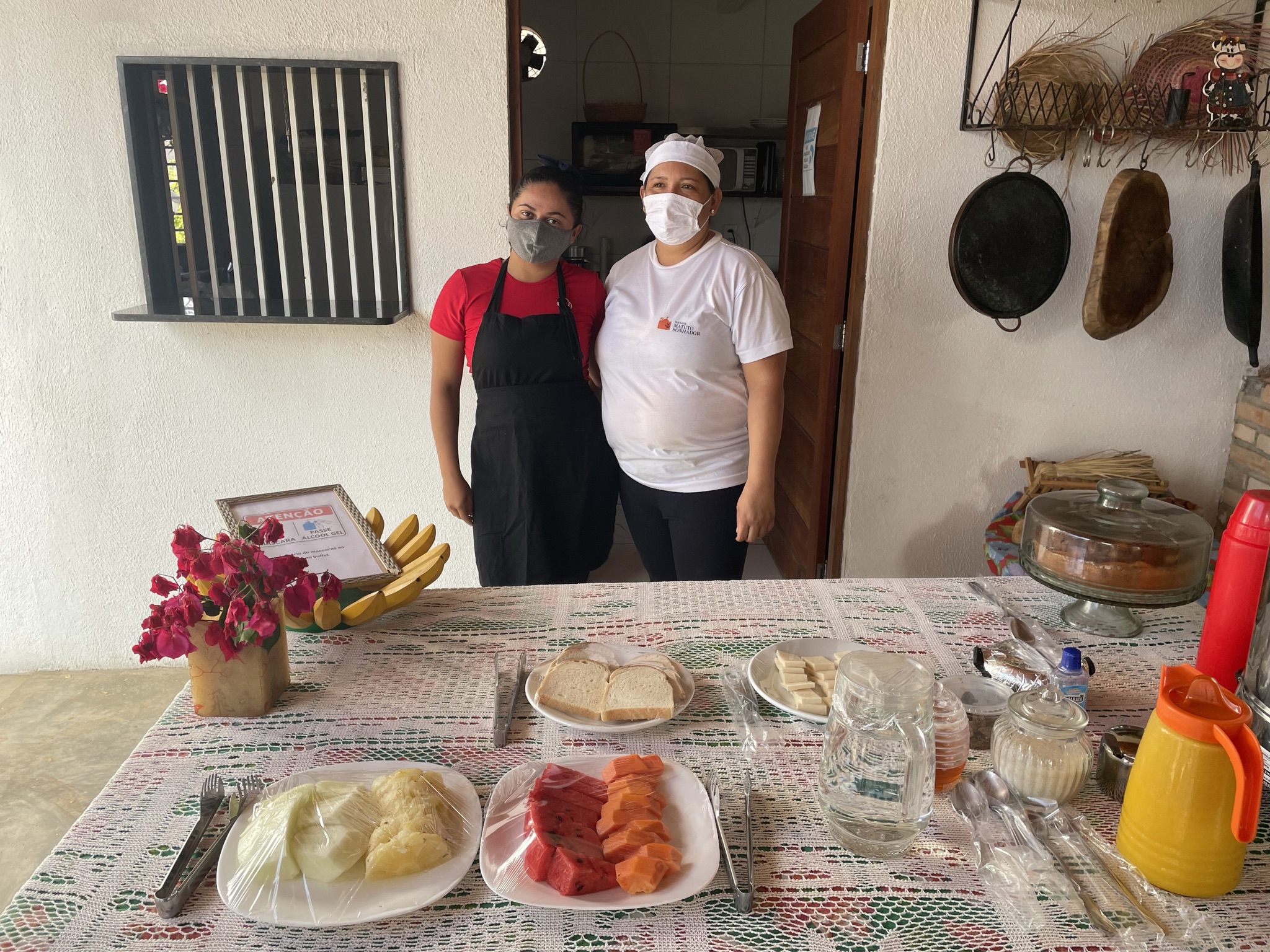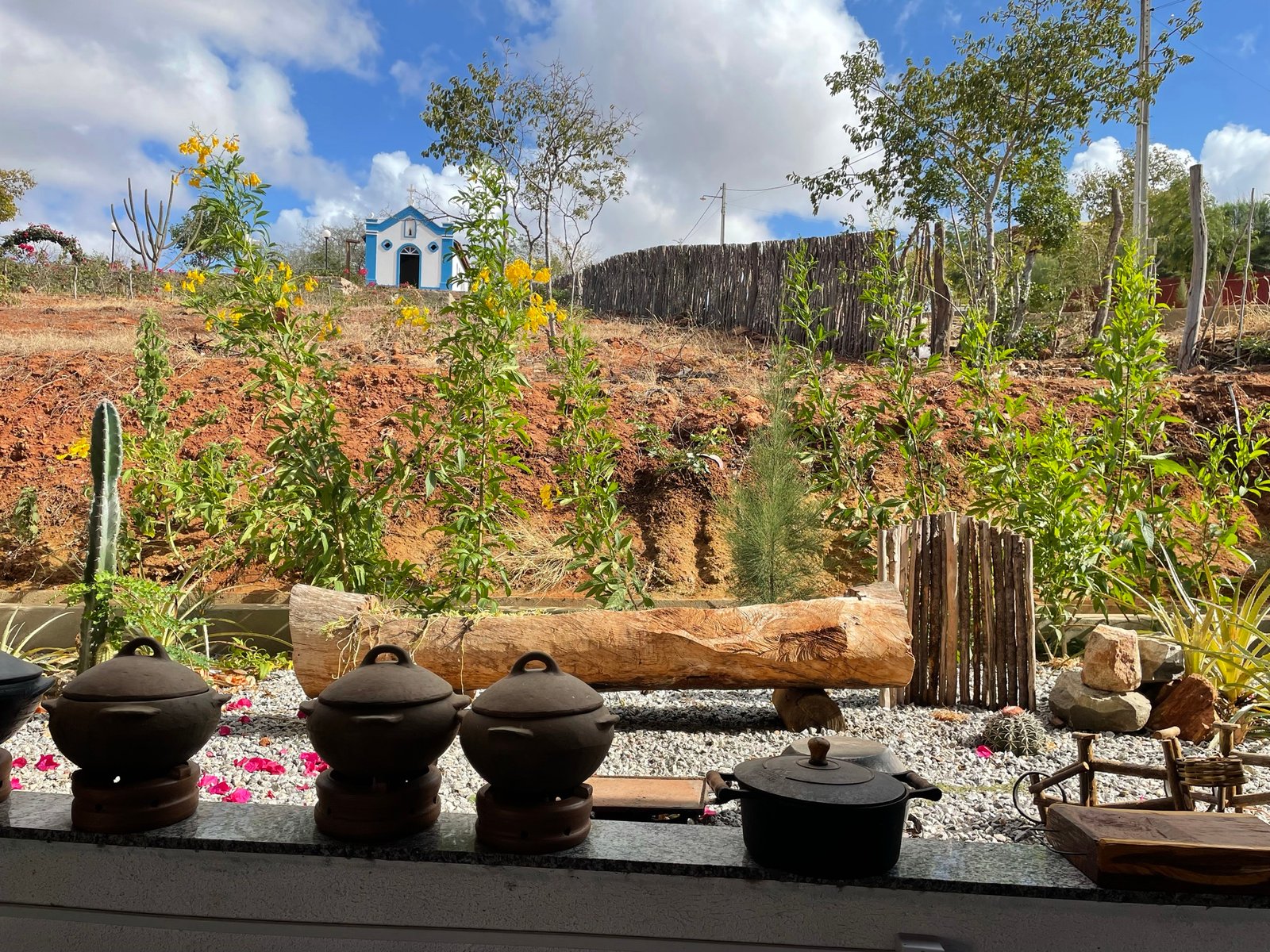 Na manhã seguinte, seguimos para a área do restaurante, onde foi servido o café da manhã bem regional, com cuscuz, macaxeira, xerém e uma deliciosa galinha de capoeira. Tudo isso disposto em potes de barro, aquecidos no fogão a lenha. Sucos, frutas, café, leite, queijo, tapioca, ovos e bolos, também fizeram parte do cardápio do café da manhã na Pousada Matuto Sonhador.