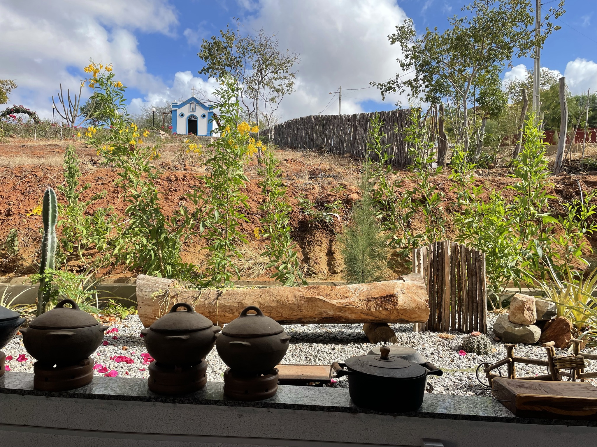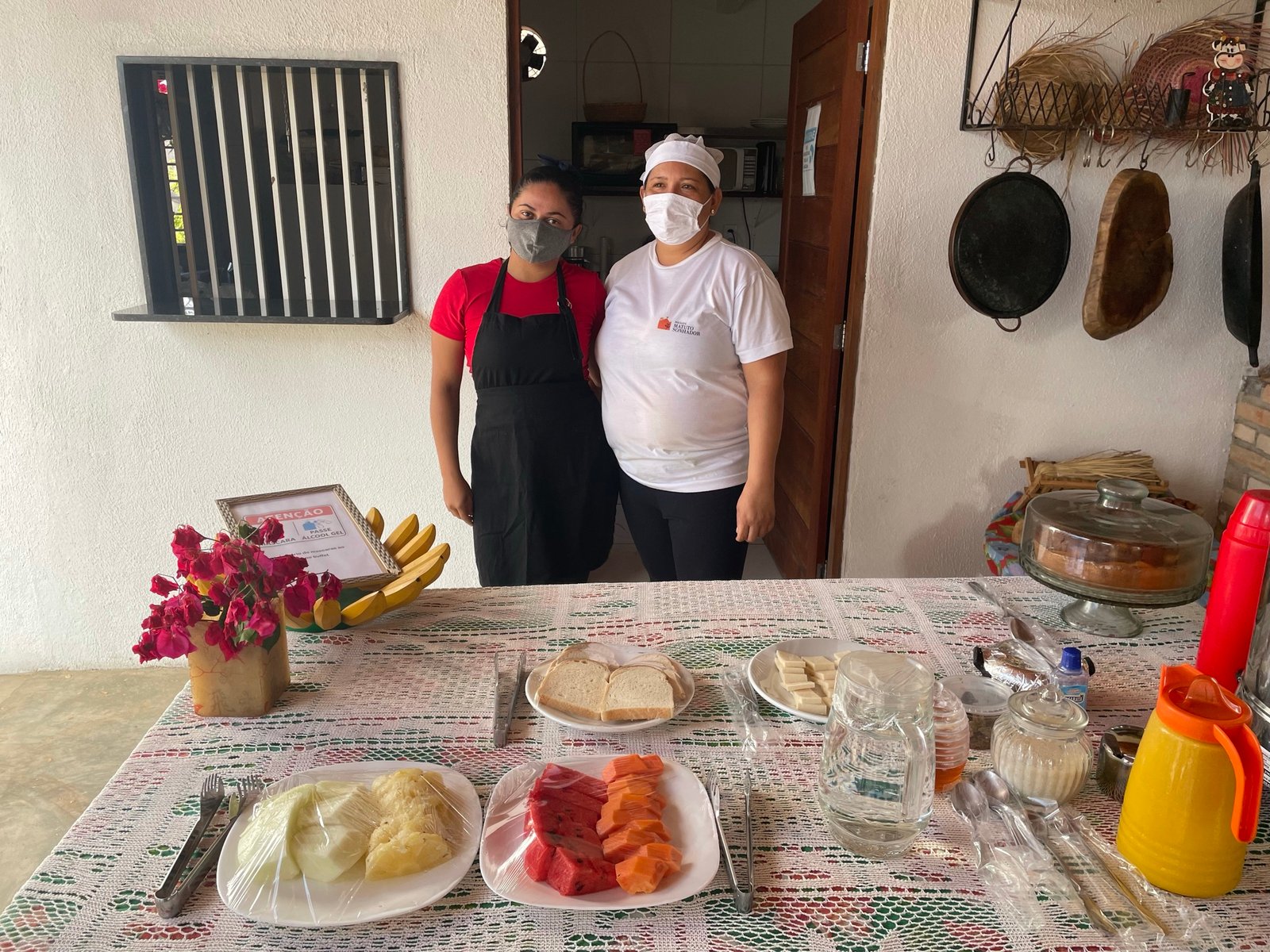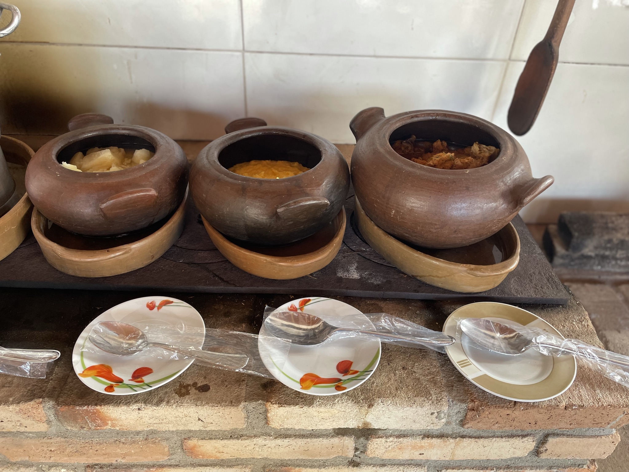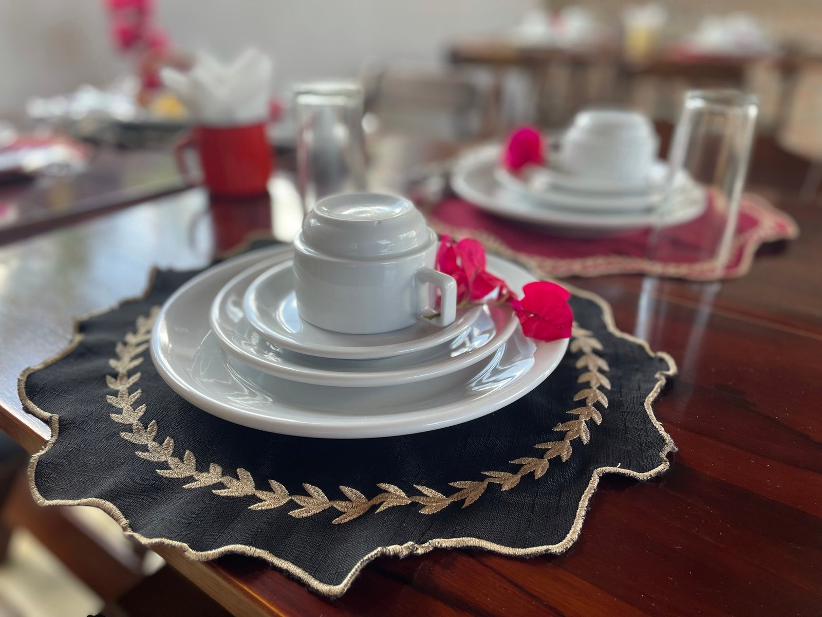 Na manhã seguinte, seguimos para a área do restaurante, onde foi servido o café da manhã bem regional, com cuscuz, macaxeira, xerém e uma deliciosa galinha de capoeira. Tudo isso disposto em potes de barro, aquecidos no fogão a lenha. Sucos, frutas, café, leite, queijo, tapioca, ovos e bolos, também fizeram parte do cardápio do café da manhã na Pousada Matuto Sonhador.