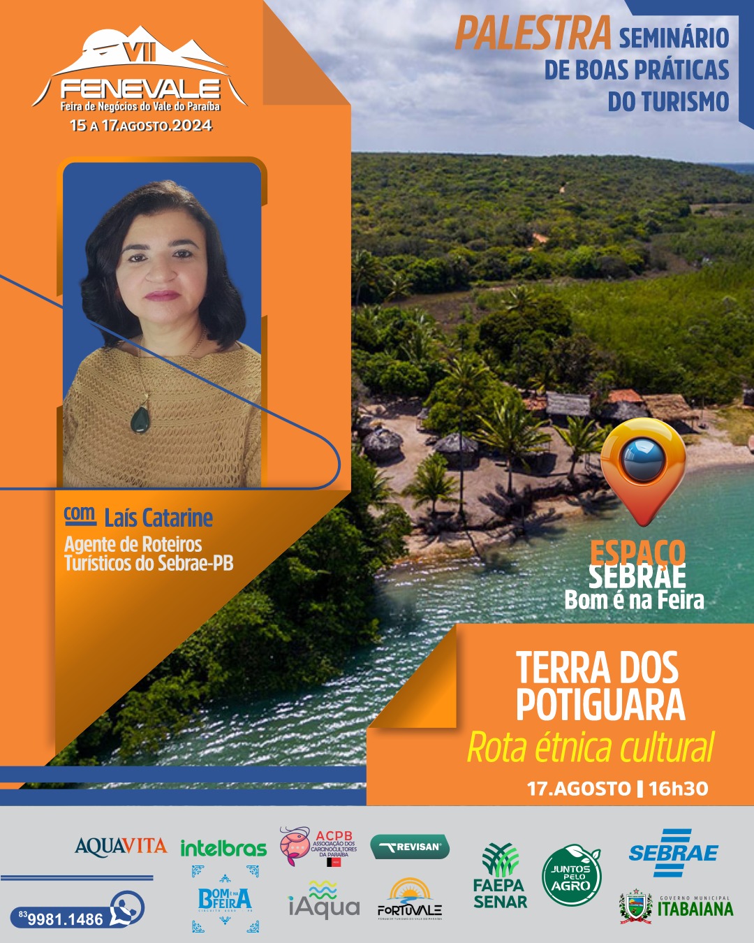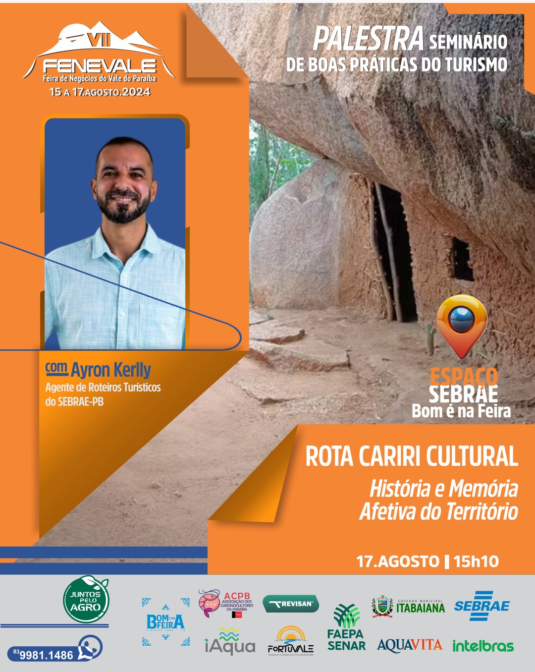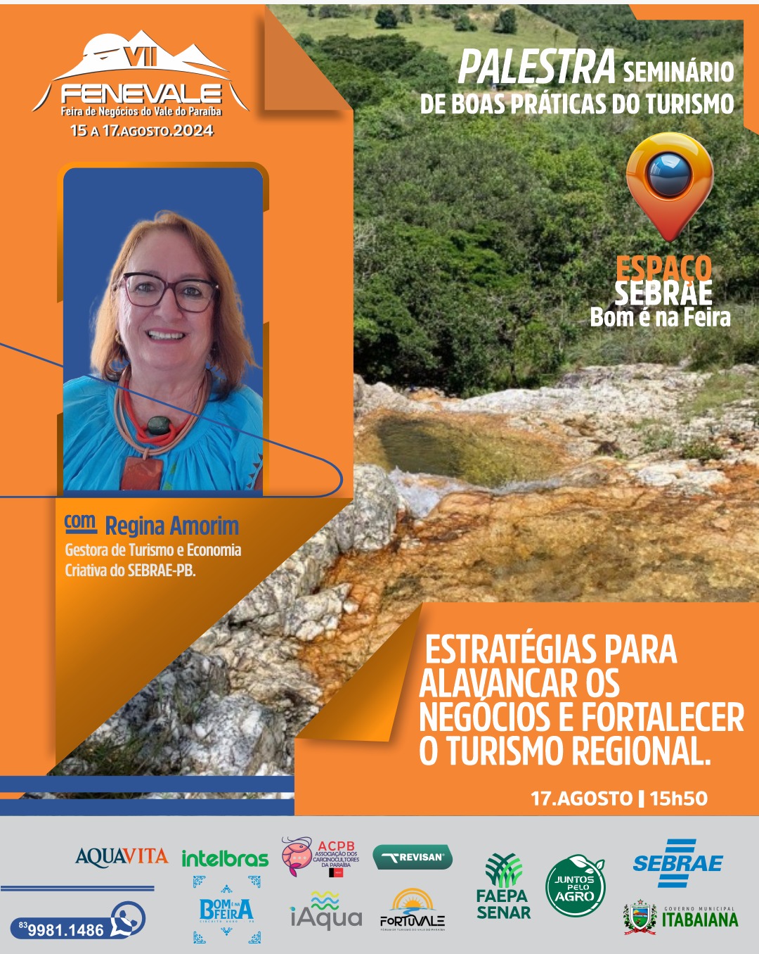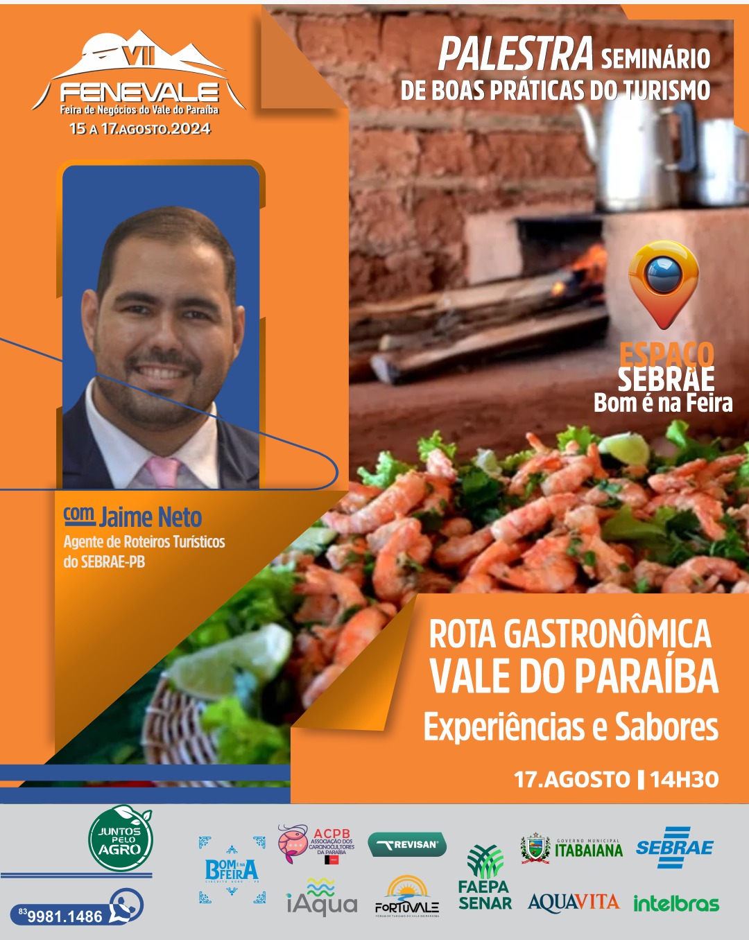 Sebrae Paraíba realizará o Seminário de Boas Práticas do Turismo no dia (17) de agosto, das 14h às 17h30, como parte da sua Programação de Conhecimentos durante a 7ª Feira de Negócios do Vale do Paraíba (FENEVALE) e o 6° Festival de Camarão, que ocorrerá entre os dias 15 e 17 de agosto, na Praça Epitácio Pessoa, em Itabaiana, PB. O evento visa compartilhar estratégias eficazes para impulsionar negócios e fortalecer o mercado de turismo regional.